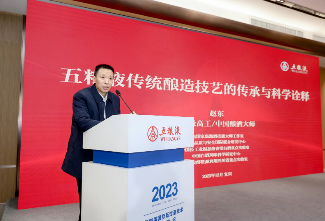 五粮液股份公司技术总顾问赵东在论坛上作《五粮液传统酿造技艺的传承与科学诠释》主题报告,从基础理论到实际研究,探讨了现代组学技术对五粮液独特的酿造微生态的诠释,让与会者对五粮液包包曲酶、窖泥微生态、健康因子、白酒风味有了更深入、更专业的理解。