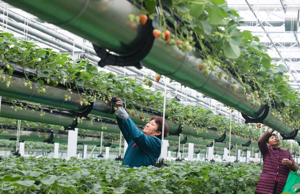 12月28日,村民在肥西县柿树岗乡周楼村数字农旅果蔬大棚里打理种植的草莓。 近日,安徽省合肥市肥西县柿树岗乡周楼村数字农旅果蔬大棚里的草莓陆续进入采摘期。近年来,安徽省合肥市肥西县积极调整农业产业结构,规模化发展草莓、花卉等特色产业种植,构建“农业+文创+旅游”的农文旅融合发展格局,有效促进农业增效、农民增收,助力乡村振兴。 新华社发(陈家乐摄)