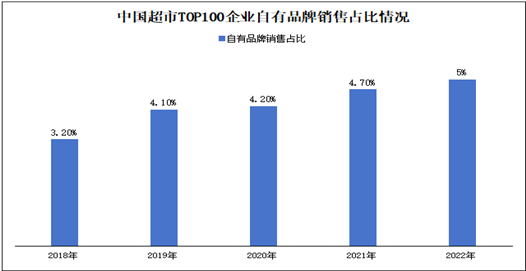 2019中国超市TOP100数据显示,2019年,中国超市TOP100企业自有品牌开发力度进一步增强,每家企业平均拥有自有品牌SKU数 865个,比上年增长了32.3%,销售占比从3.2%上升到4.1%,平均提高了28.1%。TOP100企业自有品牌商品总销售规模约400亿元,每个SKU实现销售额约50万元。2022中国超市TOP100数据显示,2022年中国超市TOP100企业自有品牌商品销售占比达5%。