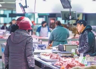 在江苏宿迁市区西楚农贸市场,市民选购肉类产品。