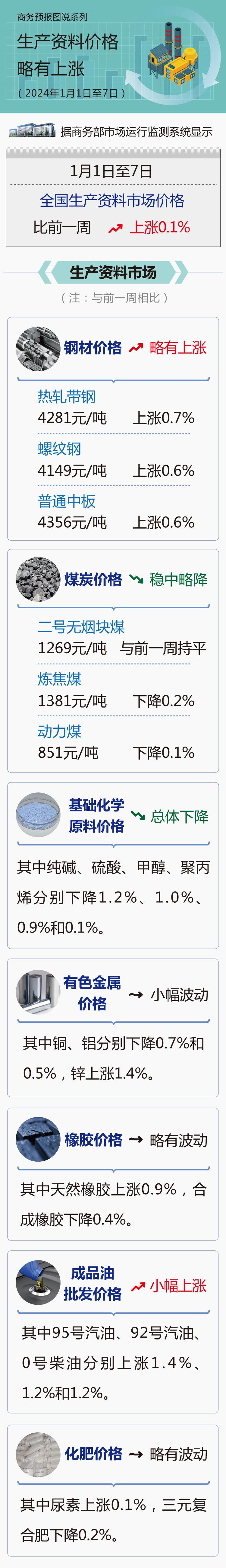 据商务部市场运行监测系统显示,1月1日至7日,全国生产资料市场价格比前一周上涨0.1%。