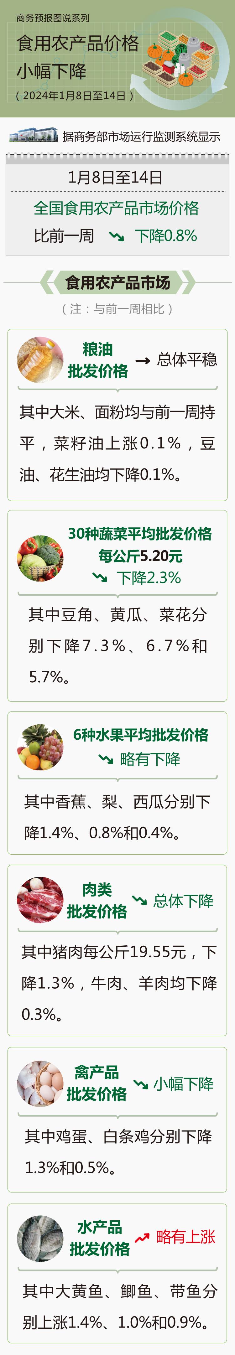 据商务部市场运行监测系统显示,1月8日至14日,全国食用农产品市场价格比前一周(环比,下同)下降0.8%。