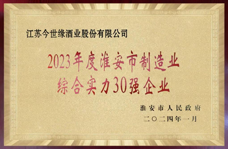 1月4日,今世缘酒业被淮安市人民政府授予“2023年度淮安市制造业综合实力30强企业”称号。