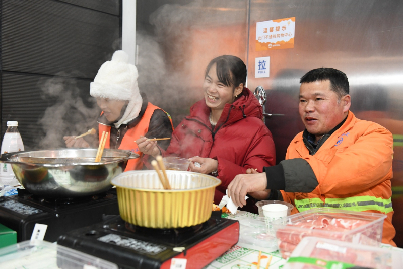 当天,驿站内热气腾腾,一席“火锅宴”,牛肉、羊肉、时鲜蔬菜等各种菜品和酱料早早摆放整齐,环卫工人和快递小哥们陆续到达。尽管室外寒风瑟瑟,但站内温暖,大家围坐桌边,聊工作、叙家常。