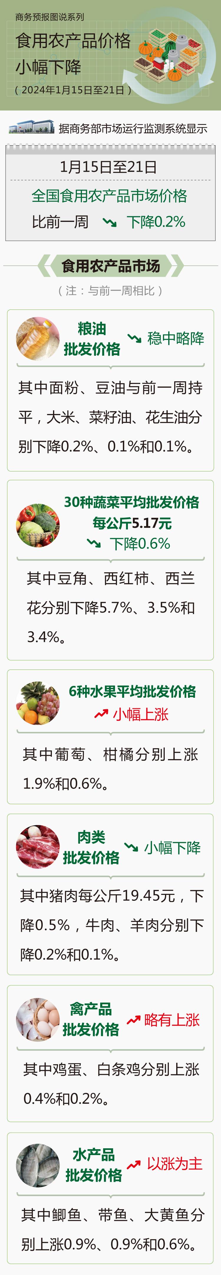 据商务部市场运行监测系统显示,1月15日至21日,全国食用农产品市场价格比前一周(环比,下同)下降0.2%。