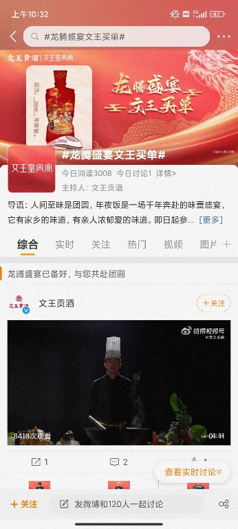 除了在营销渠道上文王贡酒打通多元场景,做到四位一体整合传播。在传播内容上更是做到了标新立异,精益求精。品质内容第一部,结合新年“龙腾盛宴 朕来买单”活动,量身定制了品牌专属宣传片《舌尖上的年夜饭》,将龙腾盛宴的诞生过程以纪录片的形式呈现,跟随镜头沉浸式体验文王贡酒的匠心打造,入目入口更入心。