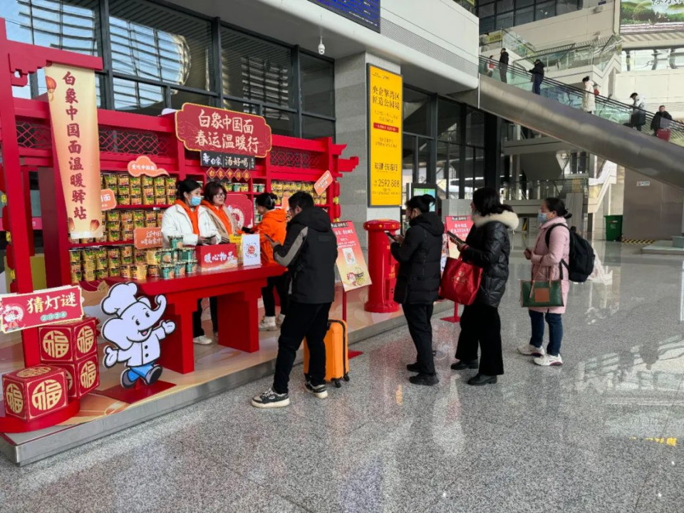 此外,和年轻人玩在一起,拥抱年轻消费群体,也是白象实现不断“翻红”的核心所在。1月26日,伴随着2024年春运潮开启,白象发起春运“白象中国面,春运温暖行”线下活动,“白象温暖驿站”将在全国近30个高铁站陆续开幕,为春运返乡人员免费提供白象汤好喝老母鸡汤面、口罩等物品,并推出行李看护等多项暖心服务。