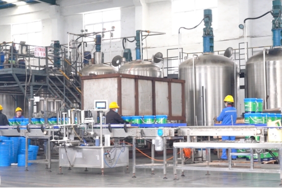 在新洋丰实验工厂水溶肥车间,工人们正将生产线上的水溶肥装桶