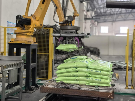 新洋丰硫酸钾复合肥厂内,无人码垛机正在将传送带上的化肥码好