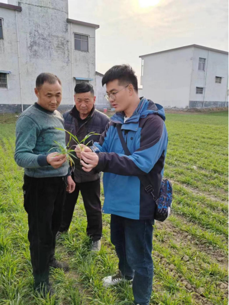 河南商丘,新洋丰农艺师孟二洋正在为农户分析苗情,指导农户做好田间管理