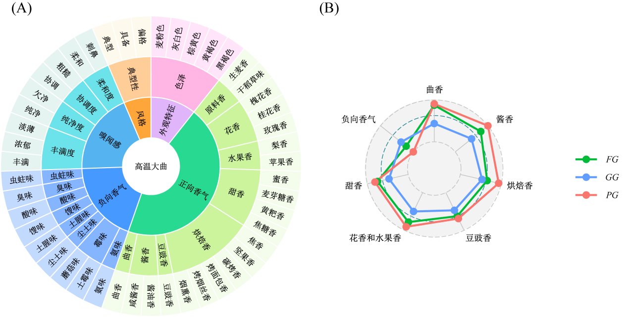 不同等级酱香型高温大曲大曲的定量描述性分析。A为风味轮,B为香气雷达图