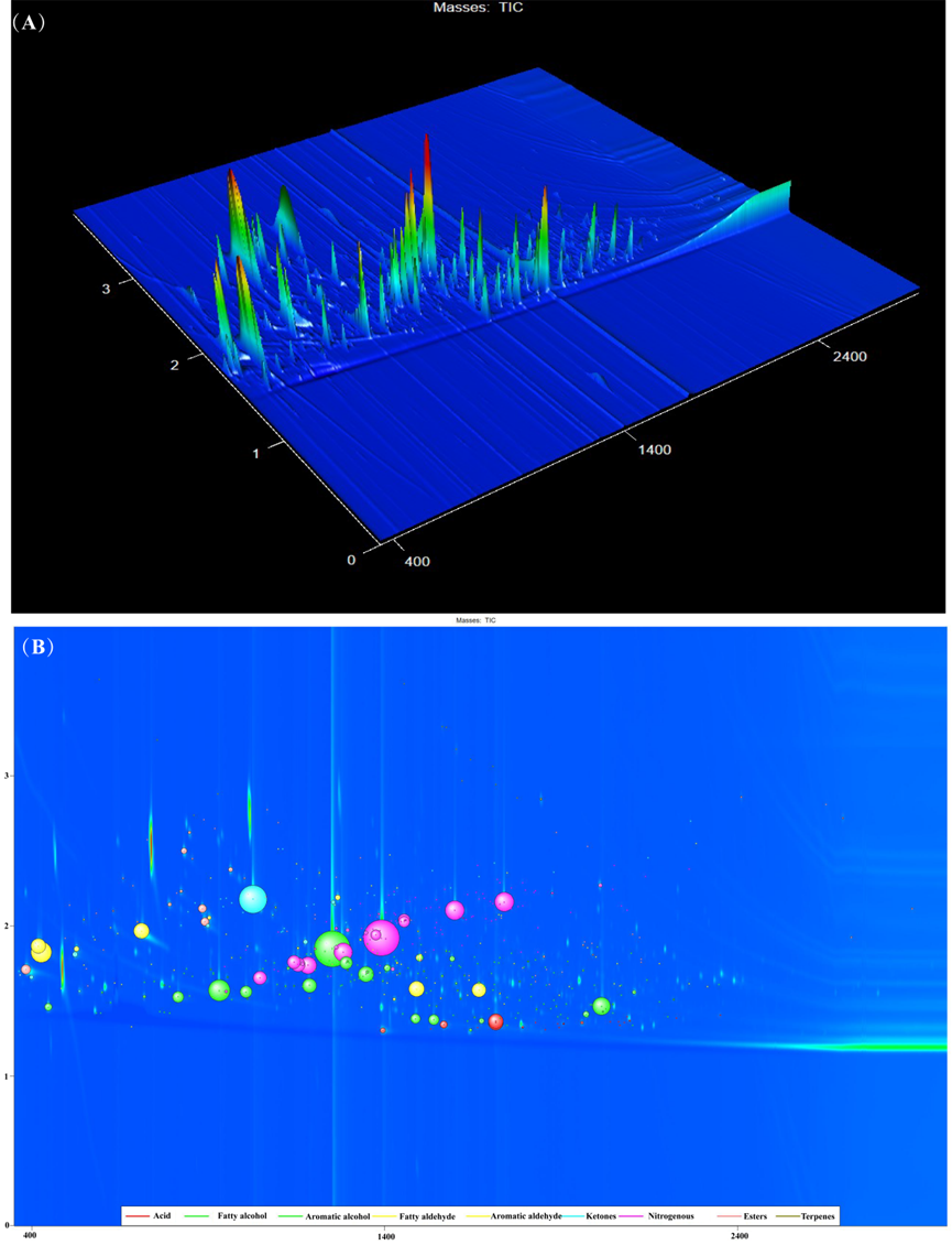 2、采用HS-SPME结合GC/GC-TOF-MS共鉴定出11类524种挥发性化合物;