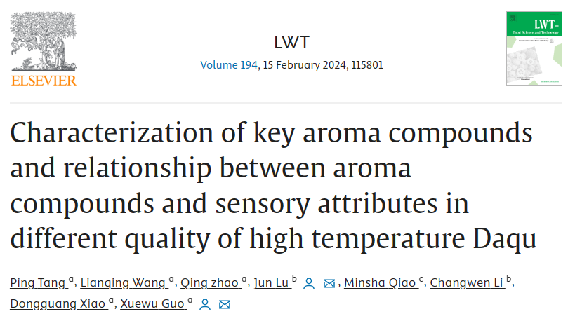 2024年1月,天津科技大学郭学武教授团队和国台酒业集团共同在国际食品顶级期刊《LWT - Food Science and Technology》发表题为“不同品质高温大曲关键香气成分的表征及其与感官属性的关系”的研究性论文。