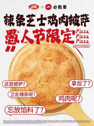 每年4月1日都是对品牌营销场的一次“试炼”,如何在比拼脑洞的同时又不至于玩出界,打造出既有趣又具有辨识度的营销内容,成为了各大品牌决胜的关键。今年4月1日,辣条界“显眼包”品牌卫龙美味(以下简称“卫龙”)又在万众期待中“显”了一把,联合必胜客品牌共同推出了限定新品“辣条芝士鸡肉披萨”,两大品牌凭借辣条与鸡肉披萨的跨界组合共同打开联名想象空间,在吊足消费者胃口的同时以诚意满满的披萨美食满足味蕾体验,为消费者带去精神与味觉上的双重愉悦。