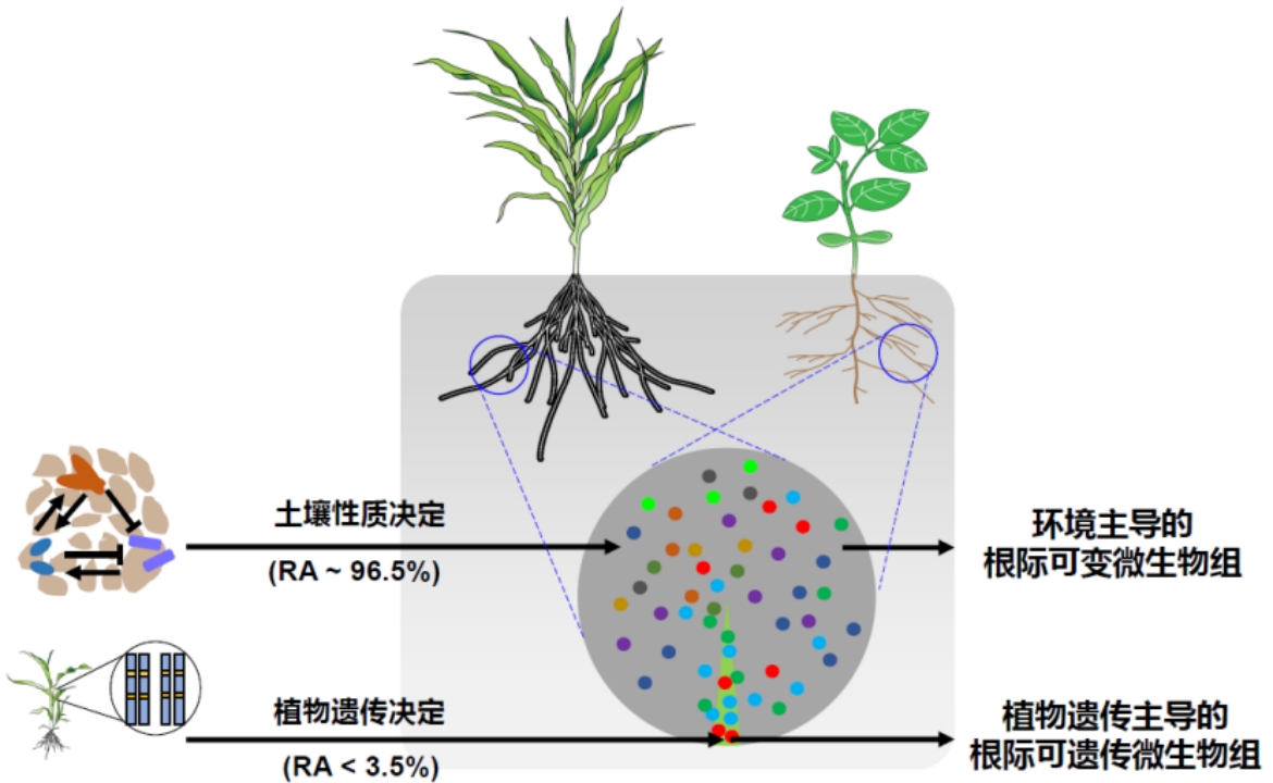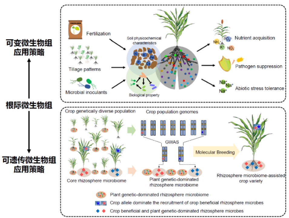 该研究根据根际微生物组的主要驱动因素,提出了根际微生物组的分类调控策略,将根际微生物组划分为由土壤性质决定的根际可变微生物组和由植物基因决定的根际可遗传微生物组。其中,根际可变微生物组的组装由根际土壤的物理、化学和生物特征决定;而根际可遗传微生物组的组装由植物遗传学决定,与根际环境无关。