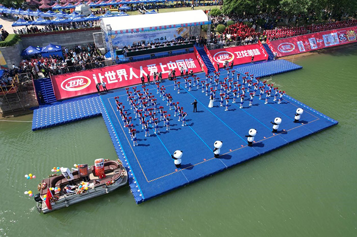 开幕式当天正值五一黄金周首日,沙澧河国家体育公园人头攒动,翘首期盼着2024漯河龙舟公开赛隆重启幕。振奋人心的龙舟赛事和中华传统武术、街舞、万人大合诵等一系列配套活动琴瑟和鸣,卫龙品牌亦派出自己的产品人偶方阵,憨态可掬的卫龙霸道熊猫舞蹈团队用劲歌热舞来表达卫龙人对家乡父老的吉祥祝福,为广大市民和不远万里前来的游客们奉上了一场精彩纷呈的视觉盛宴。