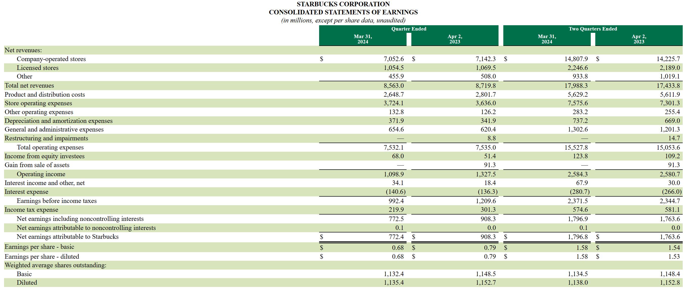 5月1日,星巴克发布2024财年第二季度财报。披露公司Q2营收为85.63亿美元,同比下降1.8%。同店销售额下降4%,其中,美国同店销售额下降3%,中国同店销售额下降11%。净利润7.725亿美元,较去年同期的9.083亿美元下降14.96%。