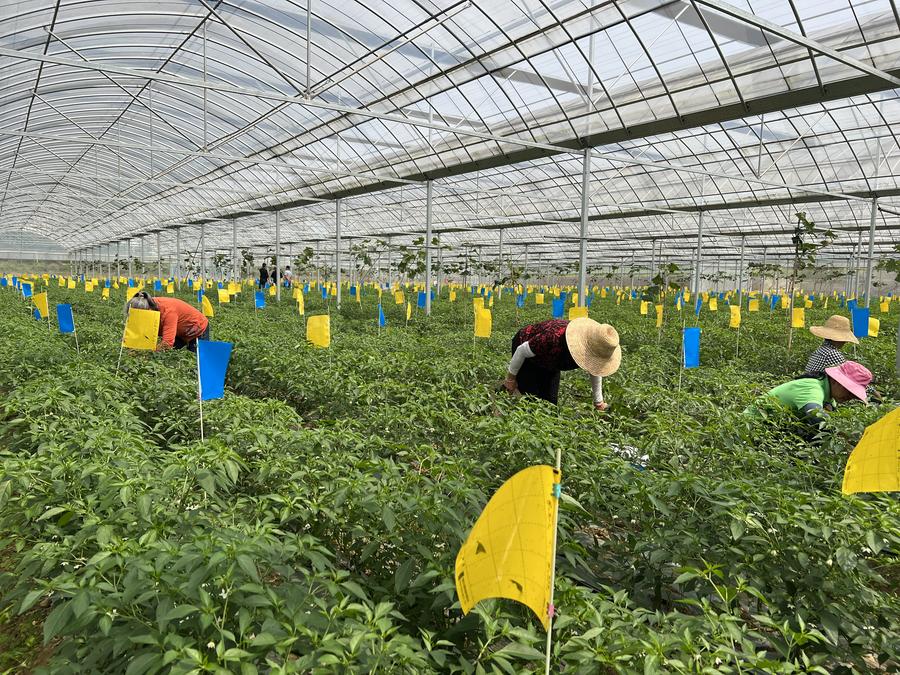 众源的辣椒基地俨然一个生态农业科技园。大棚内采用频振式杀虫灯、粘虫板、性诱捕器等绿色防控核心技术防治病虫害,集成应用“滴灌高效节水+科学精准施肥+绿色防控”技术模式,实现自动化种植。