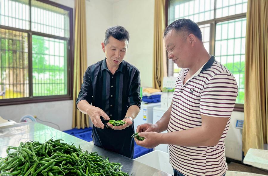 5月9日,村民邵建龙(右)将自家采摘的辣椒送到湖南众源生态农业科技发展有限公司,负责人甘镇华(左)与他一同挑选。新华社发(湘阴县委宣传部供图)