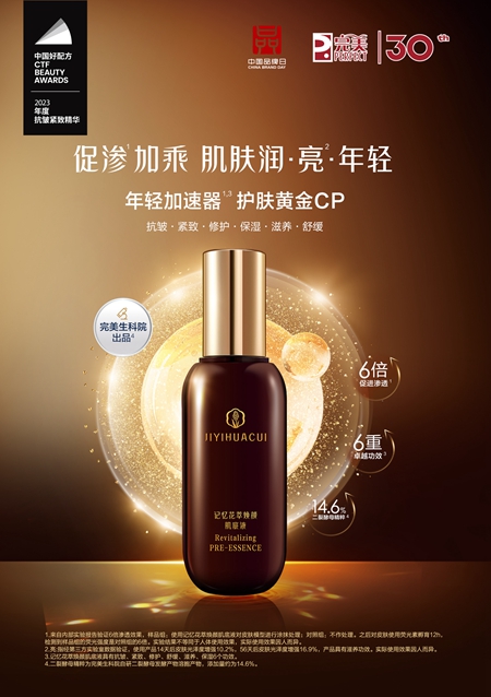 记忆花萃焕颜肌底液是完美公司基于消费者需求的深刻洞察,结合皮肤科学理论与前沿技术,在抗皱护肤品领域的创新护肤单品力作,为消费者提供了具有完美特色的东方美学护肤方案。该产品在2023年荣登“中国好配方”榜单,获评“2023年度抗皱紧致精华”。