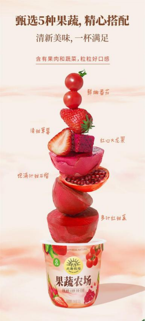 而目前在市面上,酸奶产品主要以原味、果味为主,果蔬与酸奶组合的产品几乎未见。北海牧场坚持不断创新,将果蔬与酸奶结合,打造出差异化的产品特色,在健康营养的同时,也为消费者带来了全新的口味体验。