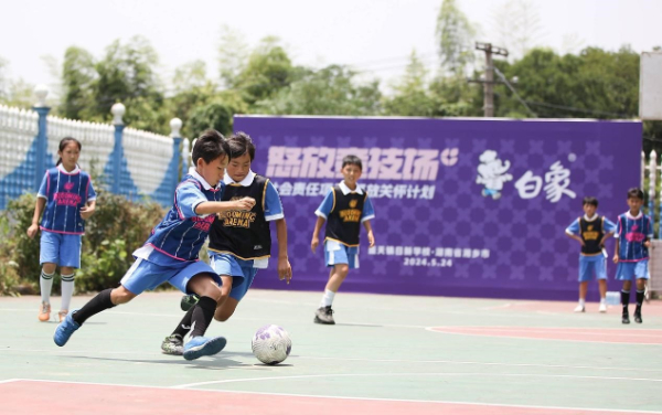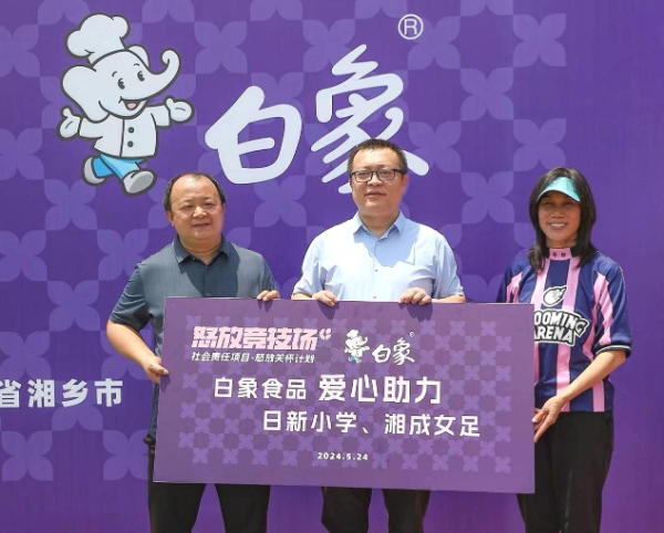 5月24日,由白象食品与国内首个街头女子足球赛事品牌“怒放竞技场”共同举办的“白象中国面·怒放关怀计划”社会公益活动在湖南湘乡壶天镇日新小学顺利举行。初代铿锵玫瑰代表人物范运杰、白象食品集团公共事务负责人张志远等嘉宾一起亲临现场,与全校师生共同开启别具一格的足球互动交流,共享快乐的足球文化,传递顽强拼搏、永不言败的女足精神。此外,作为2024“怒放竞技场”赛事合作伙伴,白象食品还向日新小学捐赠了物资,并与到场嘉宾、全校师生合影留念,为学生们送上了精心准备的礼物,以实际行动关爱青少年健康成长。