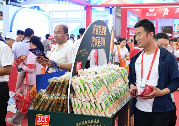 肉制品综合展区展示了简颂午餐肉、炫动番茄香肠、爆浆芝士肠、爆浆芝士鱼饼等新品,金马可减盐火腿肠、轻咔能靓鸡胸肉肠、辣吗?辣、轻享鸡肉肠等特色产品,还有泡椒猪皮、虎皮鸡爪、熏烤肉肠、多彩烤肉饼等休闲零食,品种丰富、口味多样,可以满足不同消费需求。