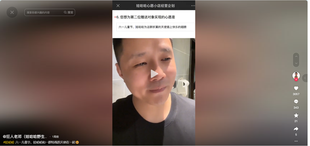 六一儿童节到来之际,抖音平台上一条视频悄然走红,一位名叫“狂人老邓”的博主在镜头前眼含热泪,略带哽咽地讲述了自己成为娃哈哈心愿店长的经历。