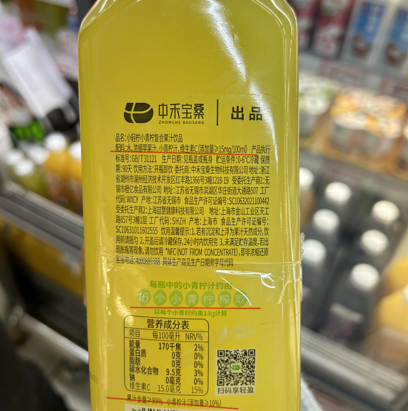 “我在超市买了一款‘中禾宝桑’牌的小青柠复合果汁饮品,这款饮品标签上醒目地写着小青柠,厂家还特地明显标注‘每瓶中的小青柠汁约由16个小青柠榨取’。谁知道买回家后仔细查看才发现,配料表上前两位竟是水和浓缩苹果汁。”姜女士提出疑问,“既然饮品中主要成分是苹果汁,是不是应该命名成苹果汁而非小青柠汁呢?”