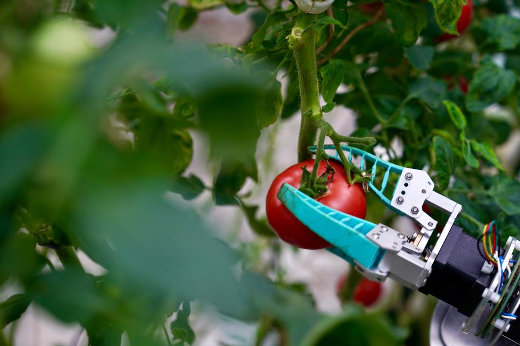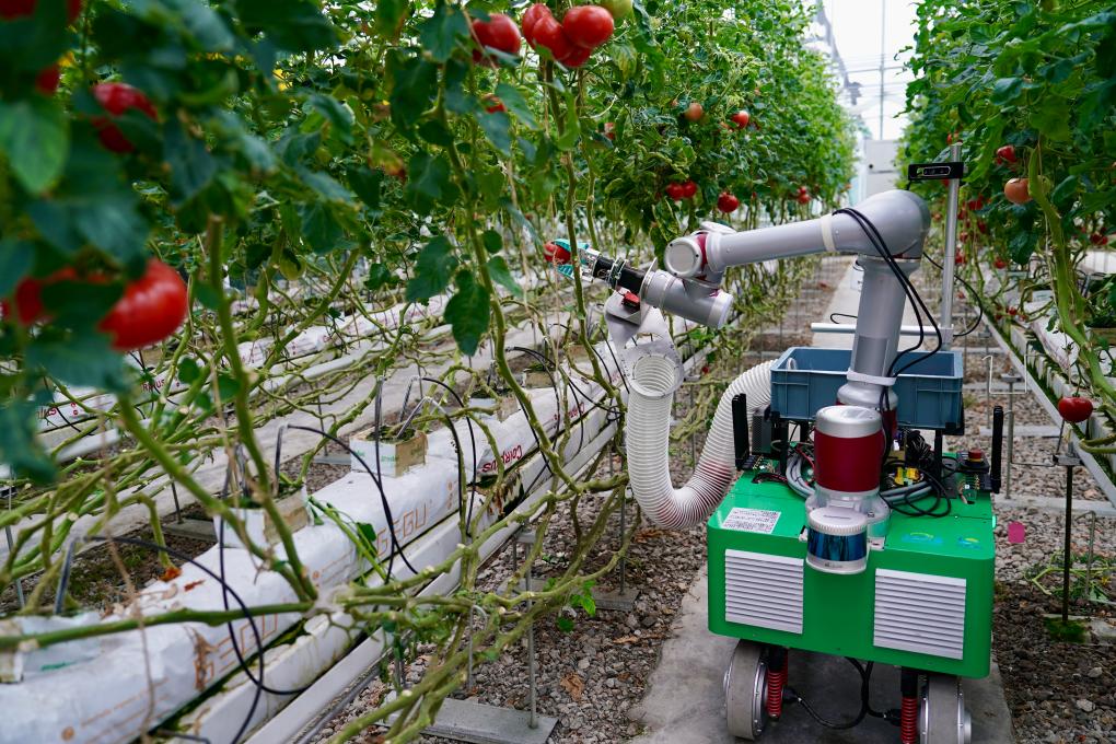 记者5日来到江苏省农业科学院的科研展示温室,看到无土栽培的番茄“喝”营养液生长,不同品种的番茄在人工智能调控的适宜温度下长势正好。工作人员正在操控采摘机器人开展采摘作业实验,机械手以旋转的方式轻松“摘”下番茄,而且不会把藤蔓拉断。