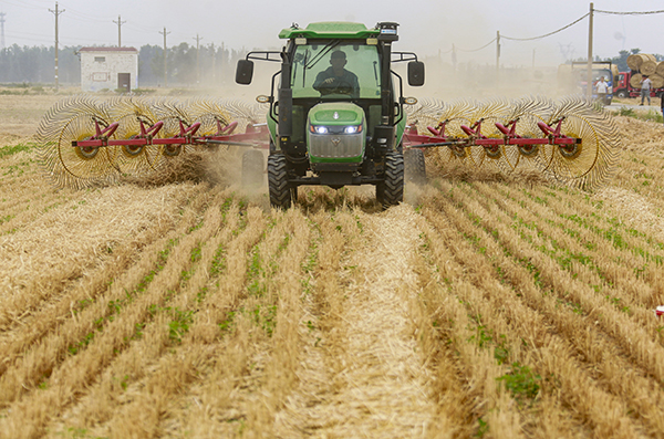 6月5日上午,河南省封丘县冯村乡刚刚收割过后的麦田里,一台台搂草机、秸秆打捆机正来回穿梭,“吐”出一捆捆金灿灿的“麦秸卷”。