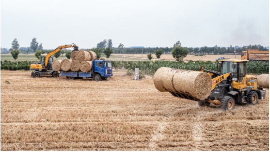 专用装卸机械正在将一个个打包好的“麦秸卷”装上车。