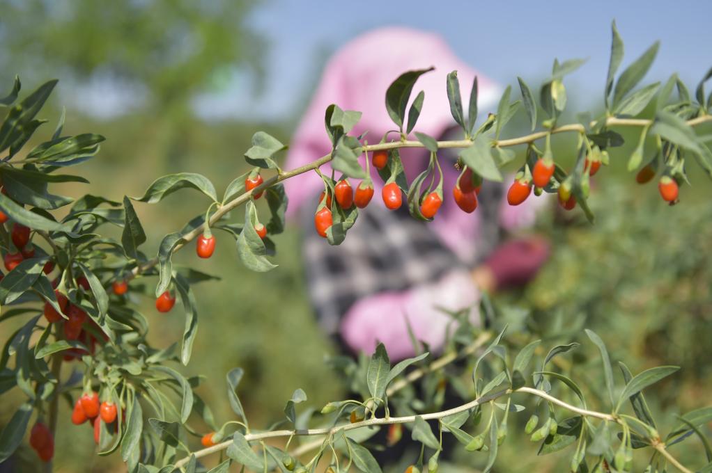 近日,宁夏中卫市中宁县万亩枸杞陆续进入采摘期,枸杞种植园呈现出一派繁忙的丰收景象。