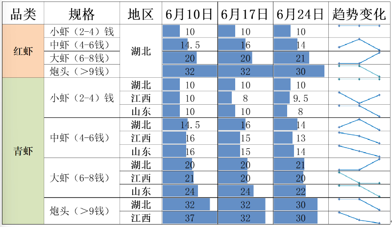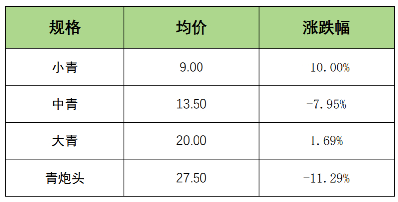 截至6月24日,青虾均价报17.50元/斤,环比下跌7.08%。其中,小青均价报9.00元/斤,环比下跌10.00%;中青均价报13.50元/斤,环比下跌7.95%;大青均价报20.00元/斤,环比上涨1.69%;青炮头均价报27.50元/斤,环比下跌11.29%。