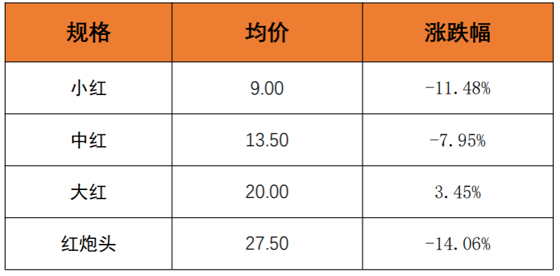 具体而言,截至6月24日,红虾均价报20.00元/斤,环比下跌8.10%。其中,小红均价报9.00元/斤,环比下跌11.48%;中红均价报13.50元/斤,环比下跌7.95%;大红均价报20.00元/斤,环比上涨3.45%;红炮头均价报27.50元/斤,环比下跌14.06%。