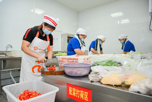 公益厨房内,工作人员在为学生准备餐食。