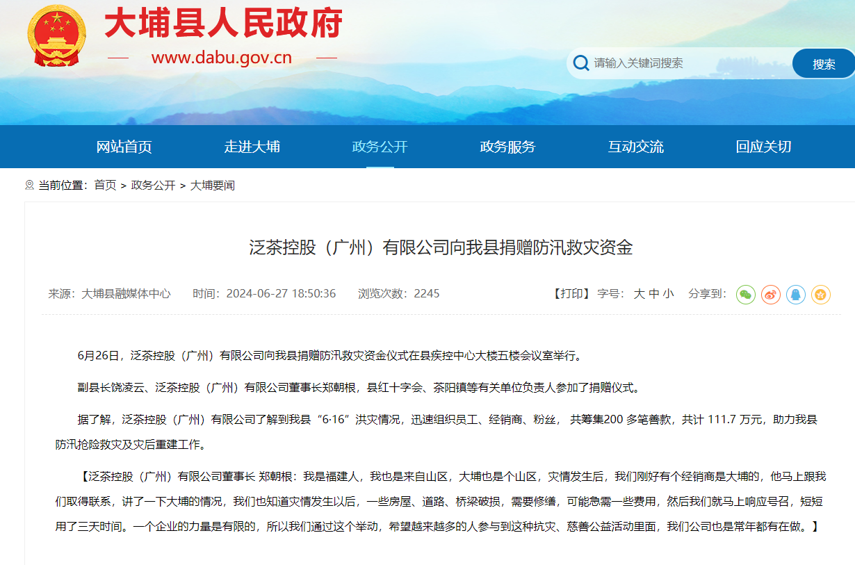 日前,广东梅州大埔县受捐一笔防汛救灾资金,捐赠防汛救灾资金仪式在大埔县疾控中心举行。