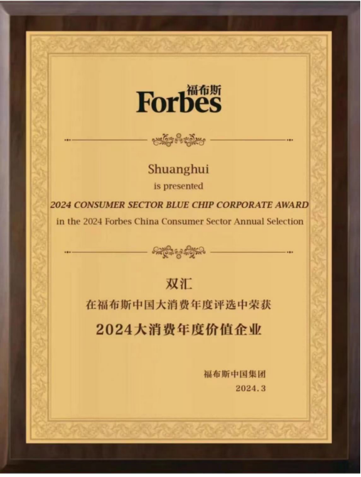 3月8日,福布斯中国携手普华永道、沙利文、中国大消费CXO创新中心在上海环球港凯悦酒店举办了“2024年中国大消费年度盛典”,并发布“2024福布斯中国大消费年度评选”结果。双汇获评福布斯“2024大消费年度价值企业”,双汇发展副总裁周霄代表企业领奖,并参加高峰论坛。此次盛典以“拼出海·沉渠道·赢未来”为主题,参会的经济学家、投资机构决策者、行业专家、品牌专家等从经济、资本、品牌、渠道等多个视角对大消费领域的创新发展、持续增长、本土深耕及出海进行了深度探讨。