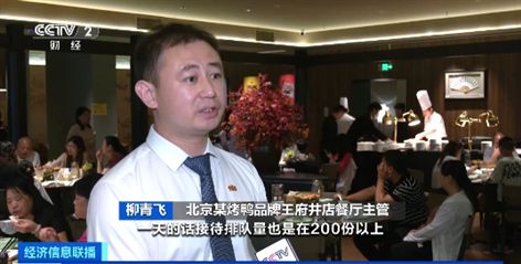 北京某烤鸭品牌王府井店餐厅主管 柳青飞:烤鸭日均接待排队量超200份,暑期之前(排队时间)一般为半个小时,暑期来临以后,排队时间增加到两个小时。