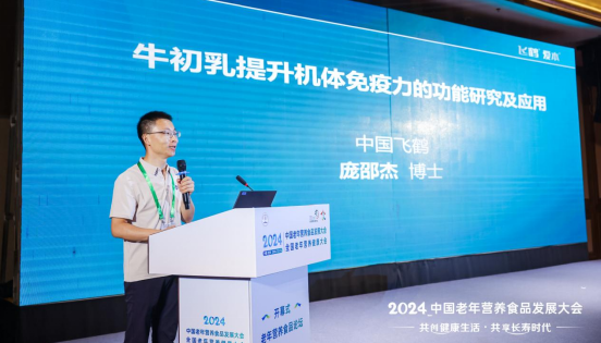 飞鹤爱本功能营养研究专家庞邵杰在大会分享《牛初乳提升机体免疫力的功能研究及应用》,他介绍了飞鹤在功能营养领域的科研投入与创新成果,深入浅出地阐述了牛初乳的独特营养价值,揭示了其在增强人体免疫力方面的科学机制;经过人群干预研究发现,牛初乳创新组合物显著提升了中老年人的免疫力,并有效延缓身体机能衰老,提升健康状态。牛初乳富含免疫球蛋白、免疫生长因子等活性物质,是天然抗衰食物。爱本牛初乳采用高于行业的标准,精准满足中老年健康需求,为身体抗衰提供新选择。