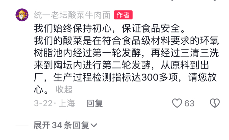 潇湘晨报记者注意到,目前统一老坛酸菜牛肉面官方账号评论区里,不少人留言询问“鼠头”一事。在官方账号3月发布的一条视频评论区里,面对关于酸菜的质疑,官方回复称,“我们的酸菜是在符合食品级材料要求的环氧树脂池内经过第一轮发酵,再经过三清三洗来到陶坛内进行第二轮发酵,从原料到出厂,生产过程检测指标达300多项,请您放心。”