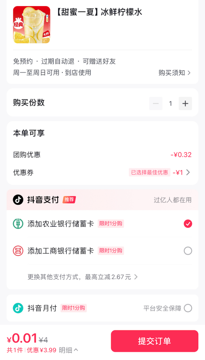 它们一致对标的,是蜜雪冰城的4元柠檬水。而蜜雪冰城也予以反击,眼下在蜜雪冰城的各渠道通过买券、团购等方式,能够买到0.01元的柠檬水。