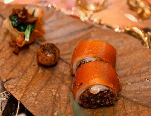 鲜黑虎掌菌是知名的出口食用菌之一,菌帽肥厚肉质细嫩,含有丰富的胞外多糖、氨基酸和微量元素,营养价值极高。李健华先以粤菜常用的大地鱼高汤煨制黑虎掌,保留其标志性的雄壮香气,再把黑虎掌和瑶柱、糯米同蒸制成浓郁鲜香的馅料卷入肥瘦相宜的乳猪猪腩件中,最后在上桌前用高度白酒现场火炙。烈焰之中,经典粤菜烤乳猪的黑虎掌火焰升级版香飘四溢,澄红清脆的乳猪皮和包裹着油脂及菌香的糯米饭,直击宾客的视觉和味觉感官,率先给晚宴掀起一个小高潮。