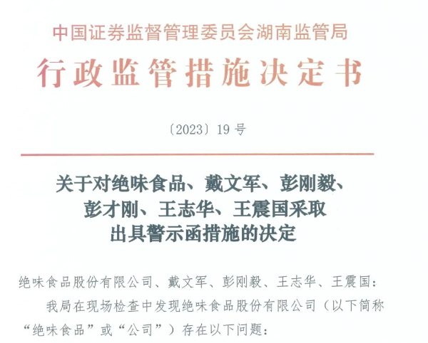 对此,湖南证监局决定对绝味食品以及相关责任人采取出具警示函措施,并记入证券期货市场诚信档案。
