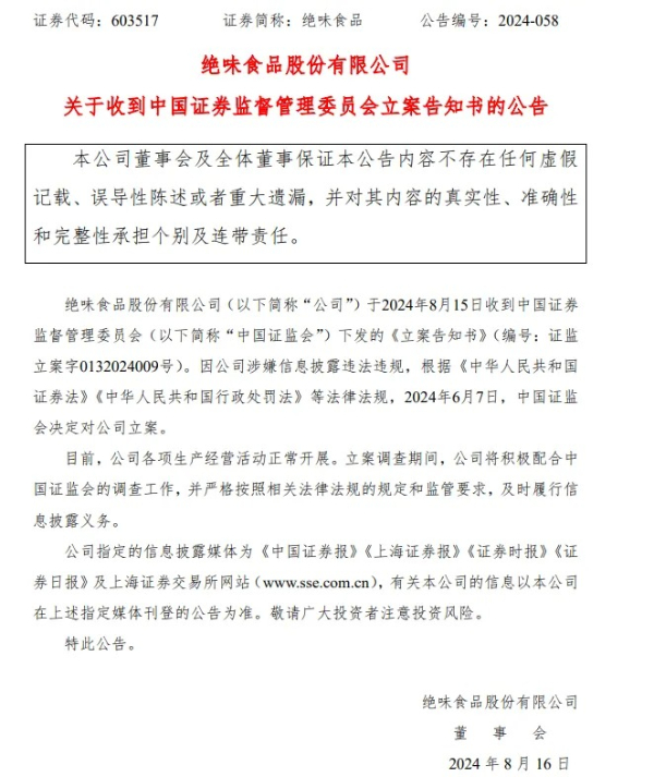 绝味食品8月16日公告称,公司收到中国证监会下发的《立案告知书》。因涉嫌信息披露违法违规,根据相关法律法规,2024年6月7日,中国证监会决定对公司立案。