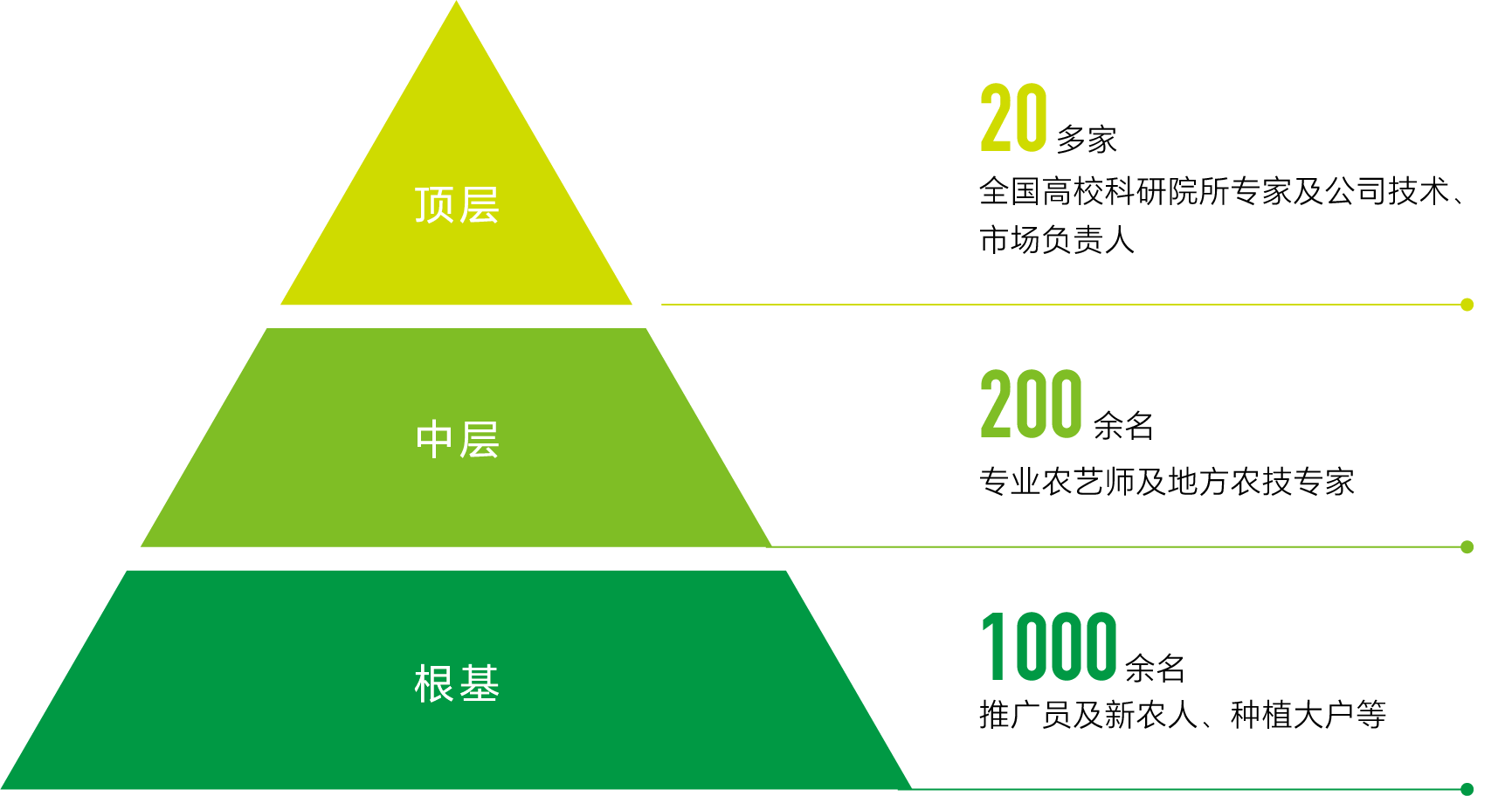 新洋丰技术服务金字塔体系层层递进、高效运作。其中,塔尖由全国20多家全国高校科研院所专家及公司自有科研专家组成,把握行业趋势,制定长远规划,开展尖端技术研究及服务体系搭建;塔中由200余名公司自有专业农艺师和地方农技部门基层专家组成,指导技术服务的实施落地;塔基由近1000名推广员组成,负责将技术和服务带到田间地头,将服务创新与农民的生产生活紧密地联系在一起。