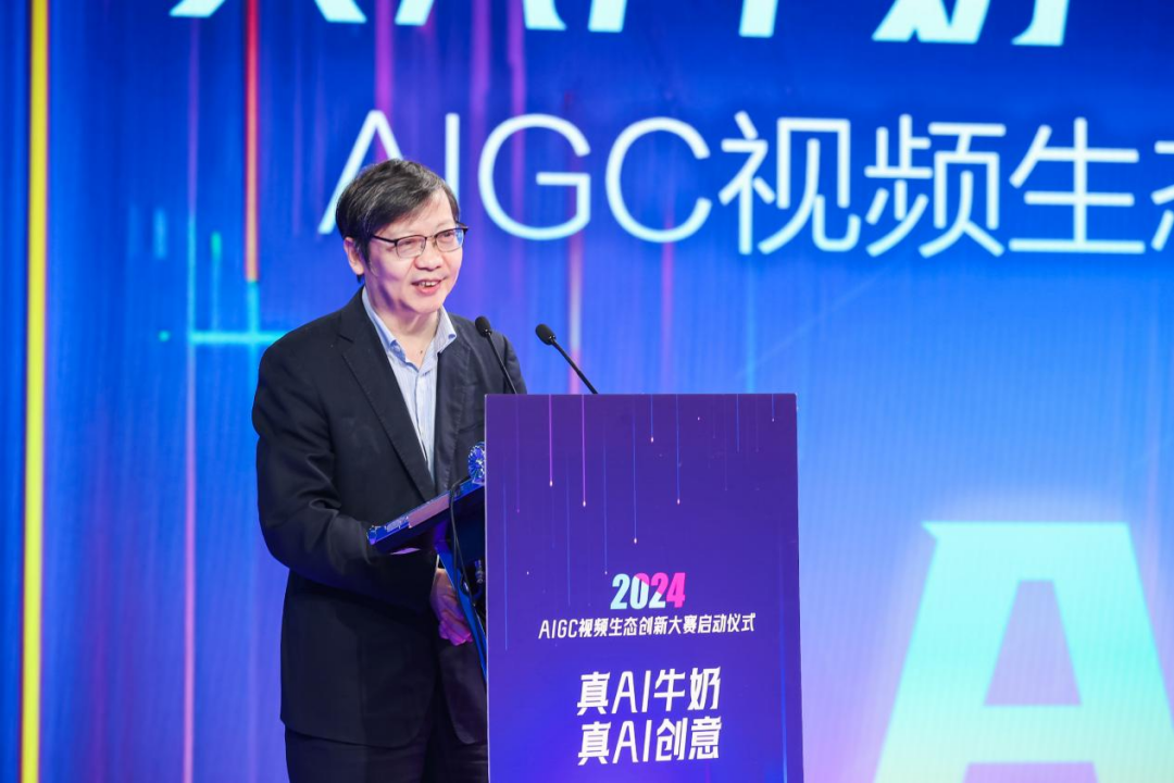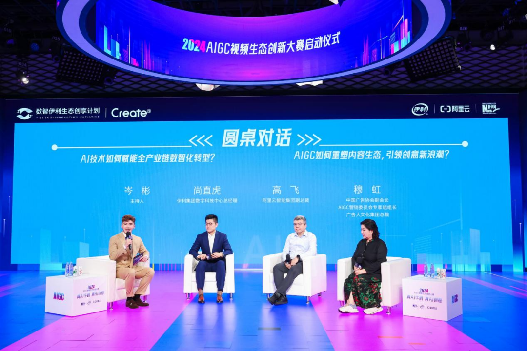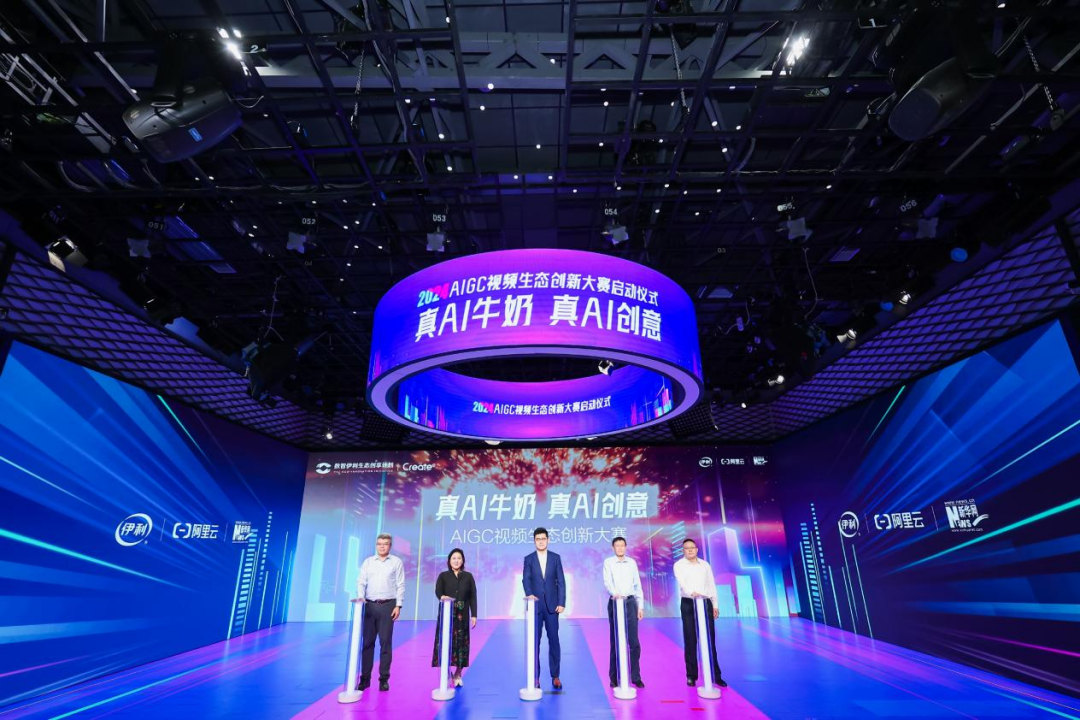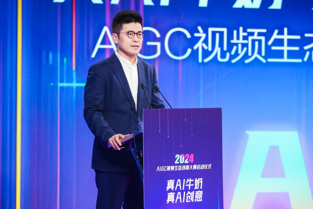 随后,工业和信息化部消费品工业司原司长高延敏,新华网首席营销官徐明伟,伊利集团数字科技中心总经理尚直虎,阿里云智能集团副总裁高飞,中国广告协会副会长、AIGC营销委员会专家组组长、广告人文化集团总裁穆虹共同启动“2024AIGC视频生态创新大赛”。