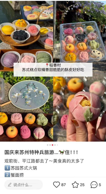 在苏州,稻香村观前街国潮体验店进店消费的客流中,年轻人占比近六成。清水玫瑰、碧螺春茶酥、手打茉莉、芝士芋头酥、草莓酸奶等持续热销,乾隆探店、苏州园林、大师作糕点等各类高颜值国潮礼盒,成为来苏州旅游的消费者必买伴手礼。同时,门店还结合传统节日氛围,推出梅花酥、胭脂酥、幸运酥、大福饼、大喜饼等多款糕点礼盒,为人们提供多样化选择。另外,位于苏州历史文化街区平江路的稻香村状元文化主题门店,每天进店选购的年轻人也是络绎不绝。很多年轻人在选购到满意的糕点伴手礼后,还专门拍照分享到社交媒体。