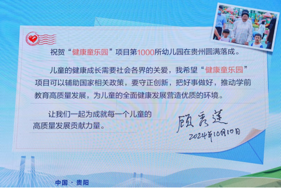 10月11日,“筑健康,赢未来—促进儿童全面健康,推动人口高质量发展”儿童健康促进大会暨“健康童乐园”1000所幼儿园落成仪式,在贵阳举行。中国关心下一代工作委员会(以下简称“中国关工委”)常务副主任刘晓连,贵州省关工委主任王正福,常务副主任唐世礼,上海市慈善基金会创会副会长余慧文,中国发展研究基金会原副理事长卢迈,中国人口与发展研究中心主任贺丹,上海交通大学党委副书记江帆,全国中小学健康教育教学指导委员会主任委员、北京大学儿童青少年卫生研究所马军,安利公益基金会主席余放,深圳壹基金基金会秘书长李弘等出席。