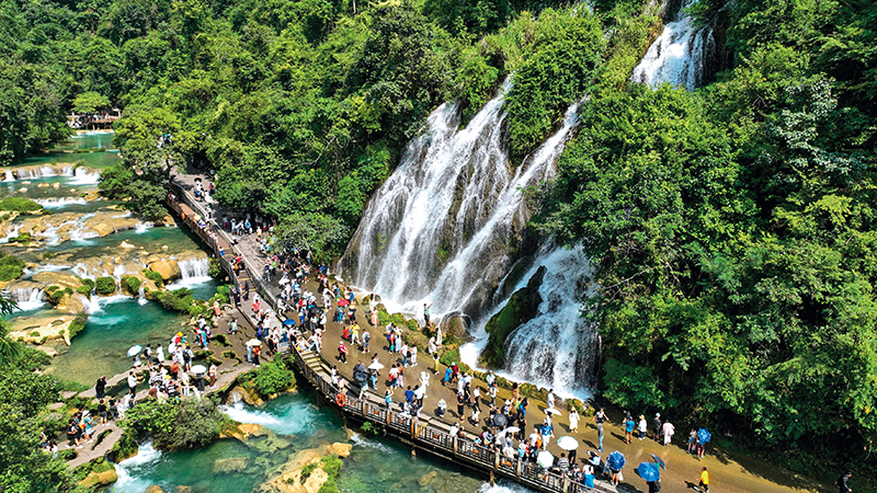 游客在贵州省黔南布依族苗族自治州荔波县小七孔景区观光游玩(2023年10月1日摄) 袁福洪摄 / 本刊